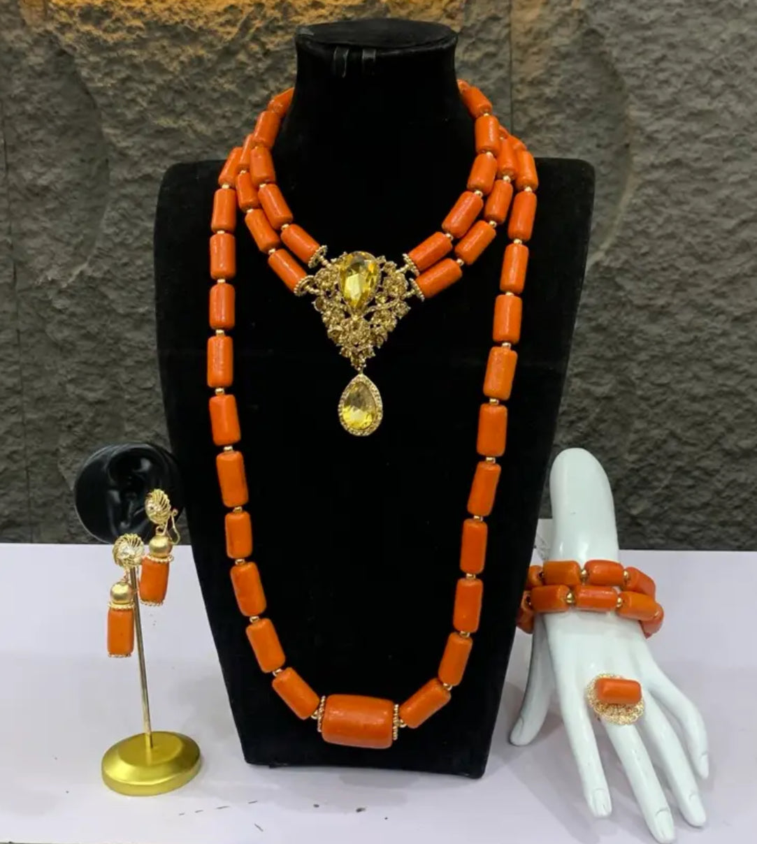 Our Nove Set is a timeless blend of tradition and elegance, beautifully crafted with genuine stick coral beads and finished with luxurious gold accessories. Designed to make a bold statement, this set is perfect for weddings, cultural celebrations, and special occasions. The rich coral beads symbolize strength and vitality, while the golden accents add a touch of sophistication and royalty.